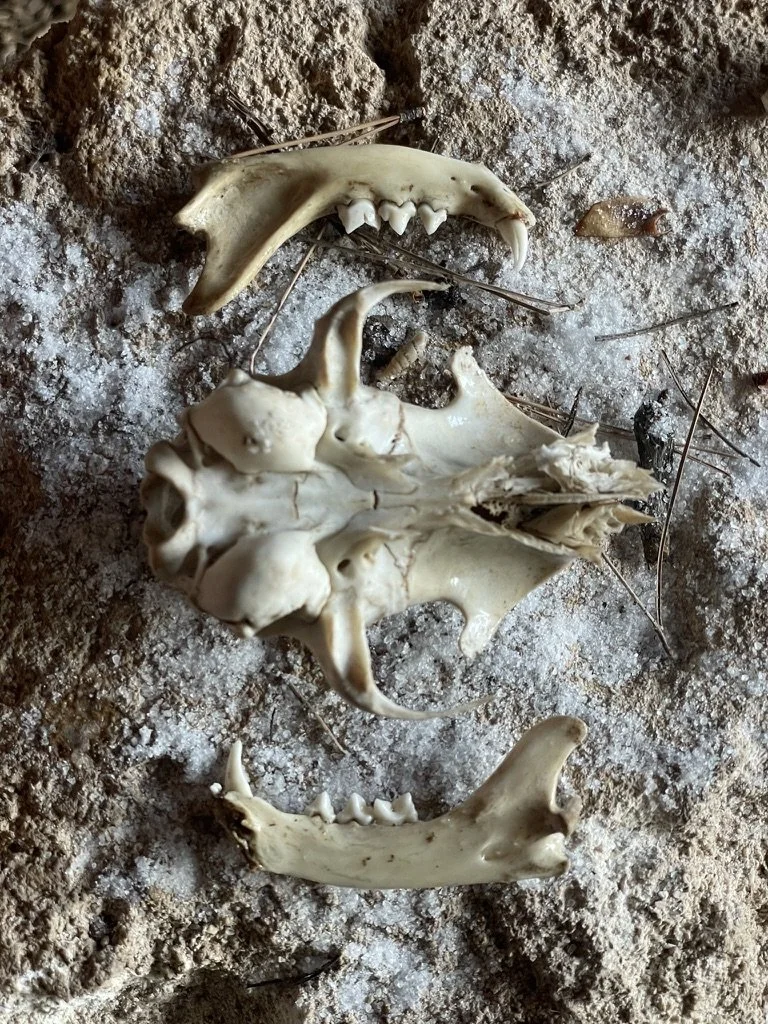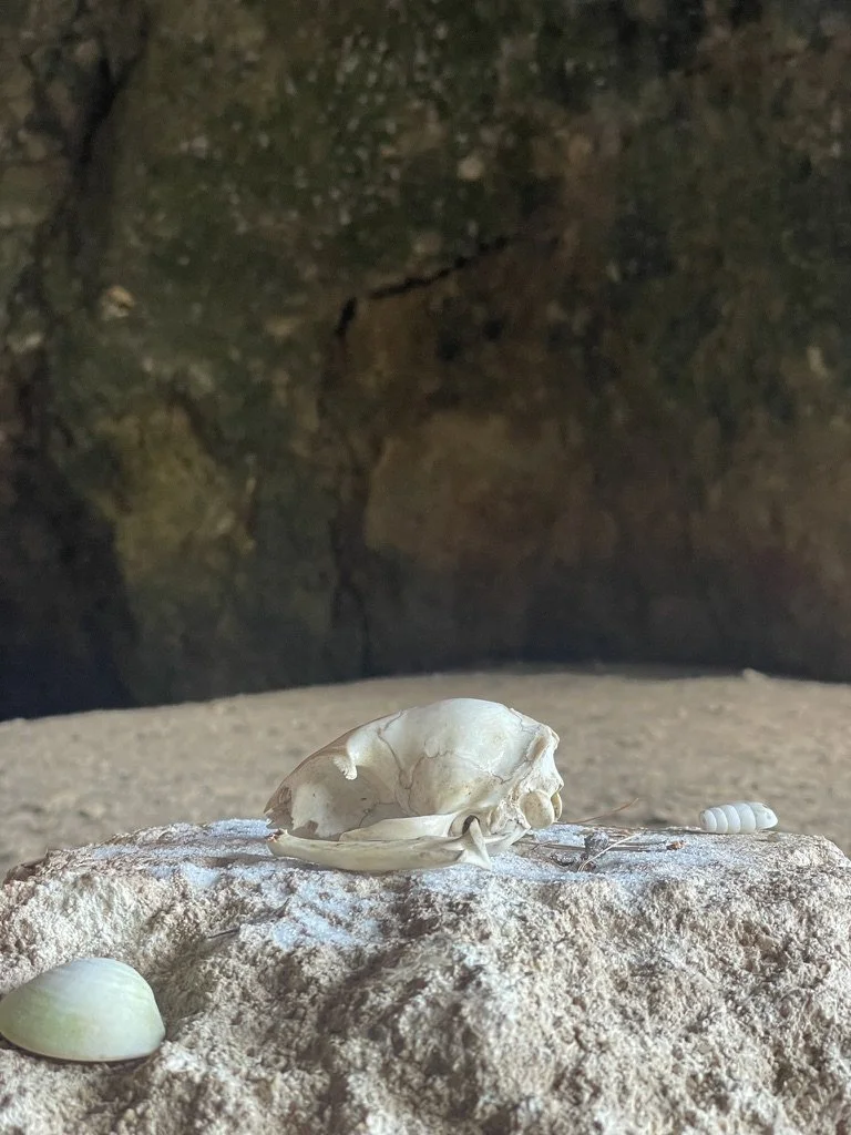 Description: During a shamanic ritual in the Pineta di Santa Caterina forest, a cat skull was discovered. This skull was then carefully cleansed on an altar within Grotta di Capelvenere using a fallen lemon and local sea salt from Morogino - the Intimate Garden of Rocks that Speak. The interplay of lemon, salt, and bone symbolizes purification and transformation, reflecting the profound connection between these elements and the spiritual essence of the grotto.