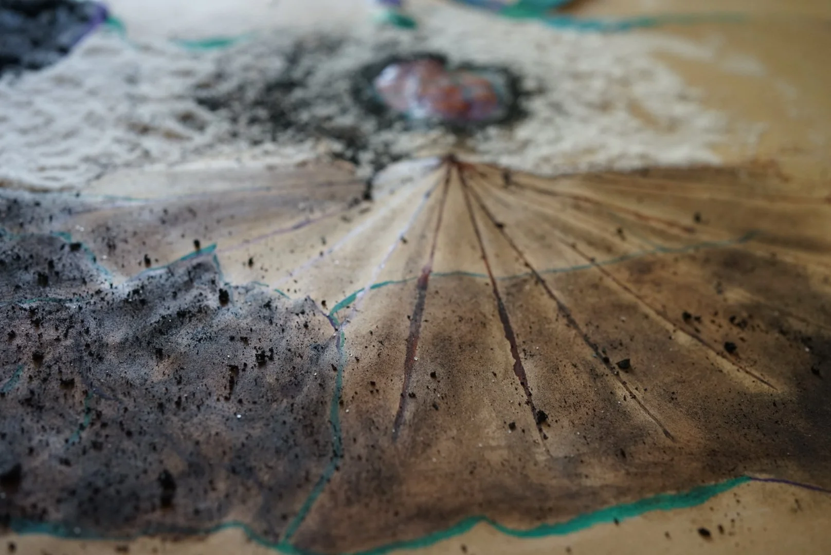 Materials: Bone, Shell, Salt, Feather, Burnt wood, Blood, Acrylic, Pastels.